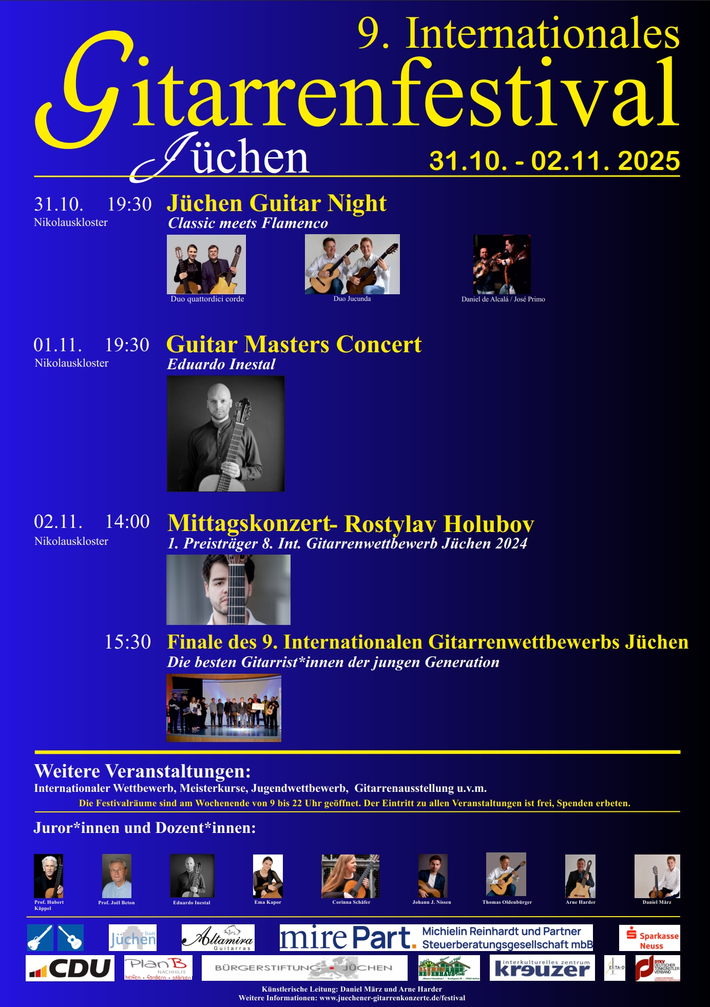 Gitarrenkonzerte! Nächstes Konzert: Eröffnungskonzert des 9. Internationalen Gitarrenfestival Jüchen ![]() Nachruf auf Pfarrer Horst Porkolab ![]() Die Evangelische Kirchengemeinde Jüchen trauert um Pfarrer Horst Porkolab, der im Alter von nur 62 Jahren nach schwerer Krankheit viel zu früh verstorben ist. Seit 1998 war Pfarrer Porkolab mit großer Hingabe in unserer Gemeinde tätig. Geboren in Siebenbürgen (Rumänien), brachte er nicht nur sein theologisches Wissen, sondern auch eine tiefe Menschlichkeit und einen weiten Horizont mit in sein Amt. Mit seinem offenen Herzen, seinem Humor und seinem festen Glauben war er vielen Menschen in Jüchen ein verlässlicher Seelsorger, Begleiter und Freund. Er hat unzählige Taufen, Konfirmationen, Trauungen und Beerdigungen begleitet, Trost gespendet und Hoffnung vermittelt. Besonders sein Engagement für die Ökumene und seine Liebe für Musik war ihm stets ein Herzensanliegen.Pfarrer Horst Porkolab hinterlässt seine Ehefrau Hedda und zwei Kinder, die ihn in Liebe und Dankbarkeit in ihrem Herzen bewahren. Wir danken Gott für das Geschenk seines Lebens und seines Dienstes unter uns. In der Hoffnung auf die Auferstehung vertrauen wir darauf, dass er nun in Gottes Frieden ruht. Für die Evangelische Kirchengemeinde Jüchen Das Presbyterium Wir sind Pfarrer Porkolab sehr dankbar, dass er uns lange Jahr für unsere Konzerte die Kirche ganz selbstverständlich zur Verfügung gestellt hat und werden ihn in Erinnerung behalten. |