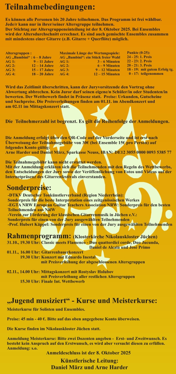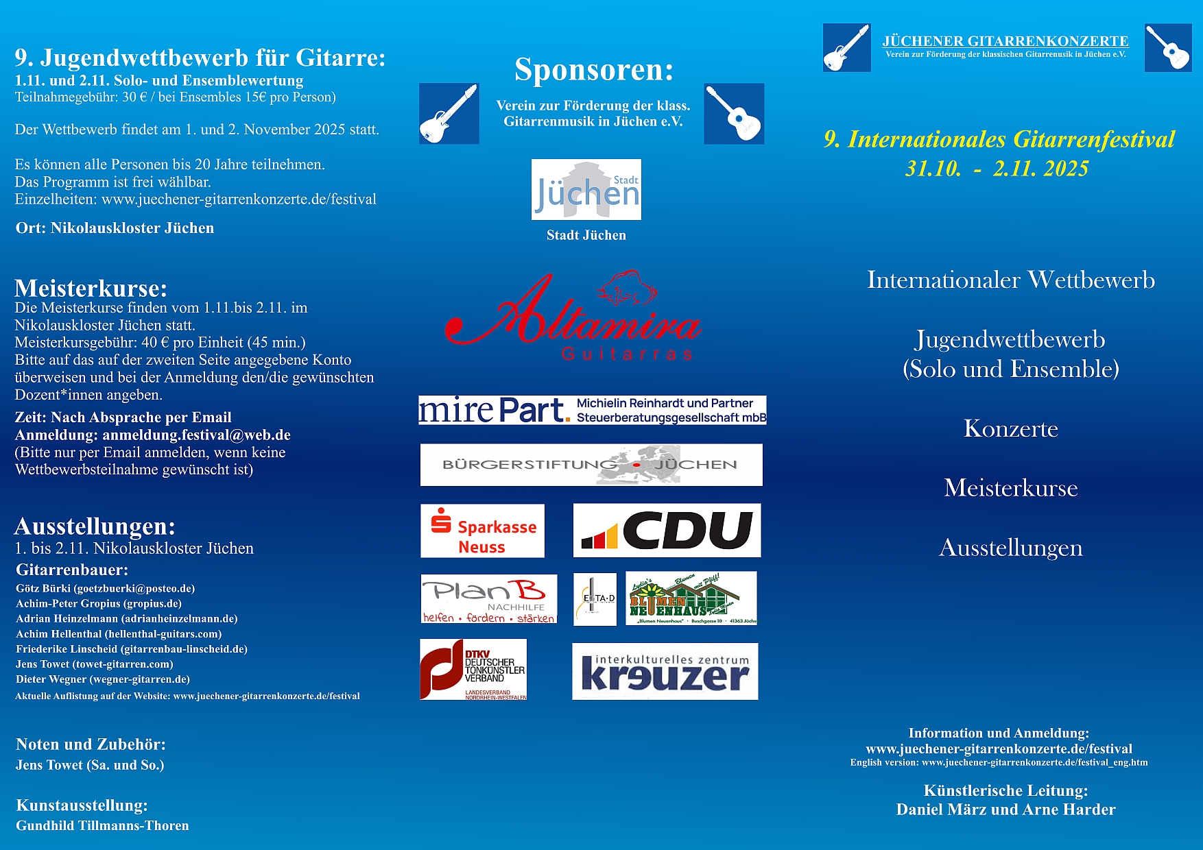 9. Internationales Gitarrenfestival Jüchen (English Version) 31. Oktober-2. November 2025 Internationaler Gitarrenwettbewerb, Jugendwettbewerb, Konzerte, Meisterkurse und Ausstellungen Alle Veranstaltungen finden im Nikolauskloster, 41363 Jüchen statt. Save the date! ![]() ![]() ![]() ![]() |