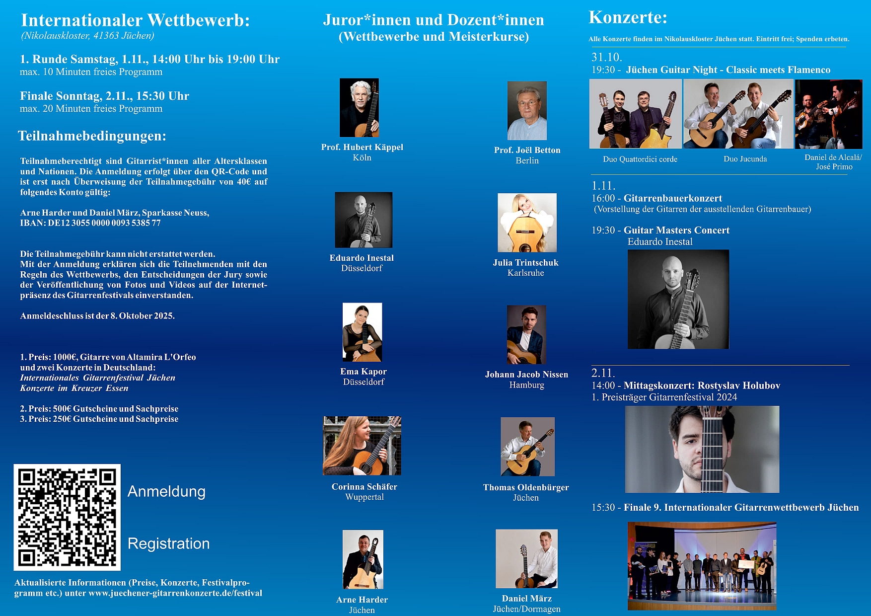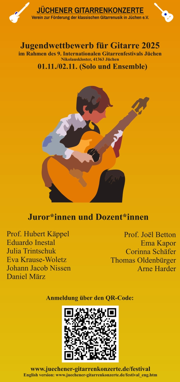 9. Internationales Gitarrenfestival Jüchen (English Version) 31. Oktober-2. November 2025 Internationaler Gitarrenwettbewerb, Jugendwettbewerb, Konzerte, Meisterkurse und Ausstellungen Alle Veranstaltungen finden im Nikolauskloster, 41363 Jüchen statt. Save the date! ![]() ![]() ![]() ![]() |