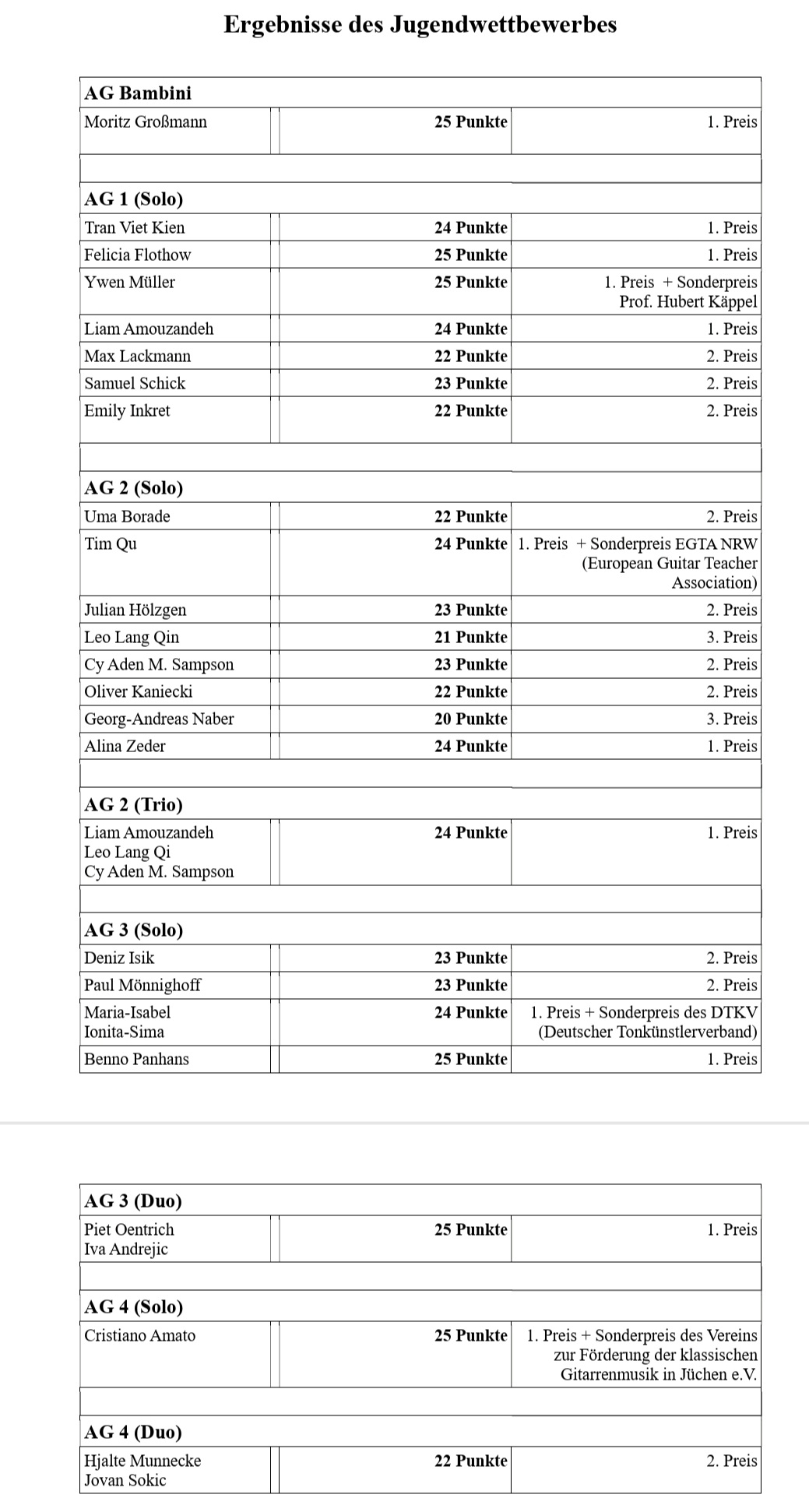 Gitarrenkonzerte! Es war ein tolles Festival 2025 im wunderbaren Ambiente des Nikolausklosters! Save the date: 10. Internationales Gitarrenfestival Jüchen 13.-15.11. 2026 auch im Nikolauskloster und Schloss Dyck 9. Gitarrenfestival Jüchen 2025 Internationaler Wettbewerb: 1. Preis: Juan Manuel Molano Posada (Kolumbien) 2. Preis: Benno Panhans (Deutschland) 3. Preis: Emilie Fend (Frankreich) / Seonghyeon Cho (Südkorea) |